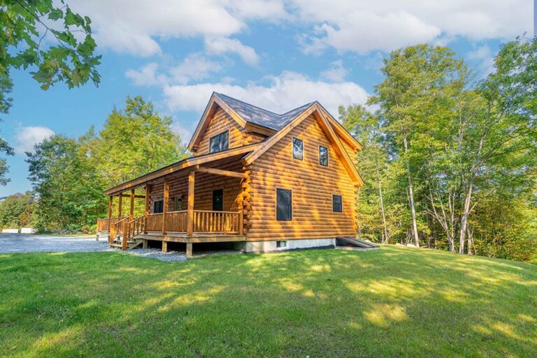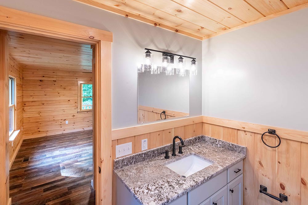 A practical take on one of our most popular log home designs, this model offers a covered front porch and open deck for outdoor living opportunities. The entrance opens to a cathedral ceiling over the living area. A shed dormer on one side and a wide gable dormer on the other, boosts its functionality and aesthetic value to the upstairs bedrooms. The master suite is on the first floor and conveniently has an adjoining walk-in closet as you enter the master bath.
