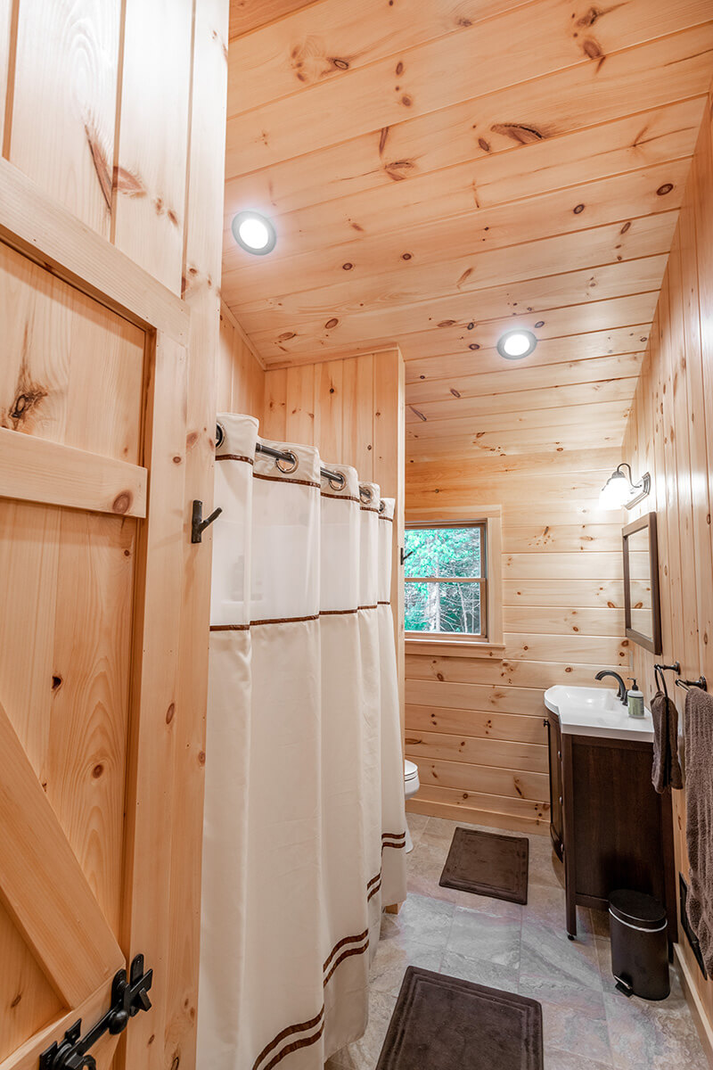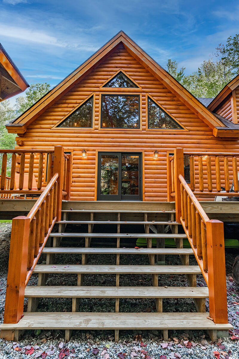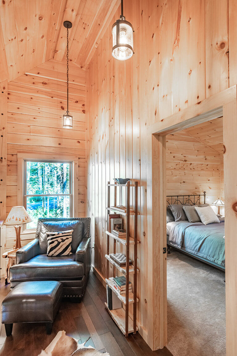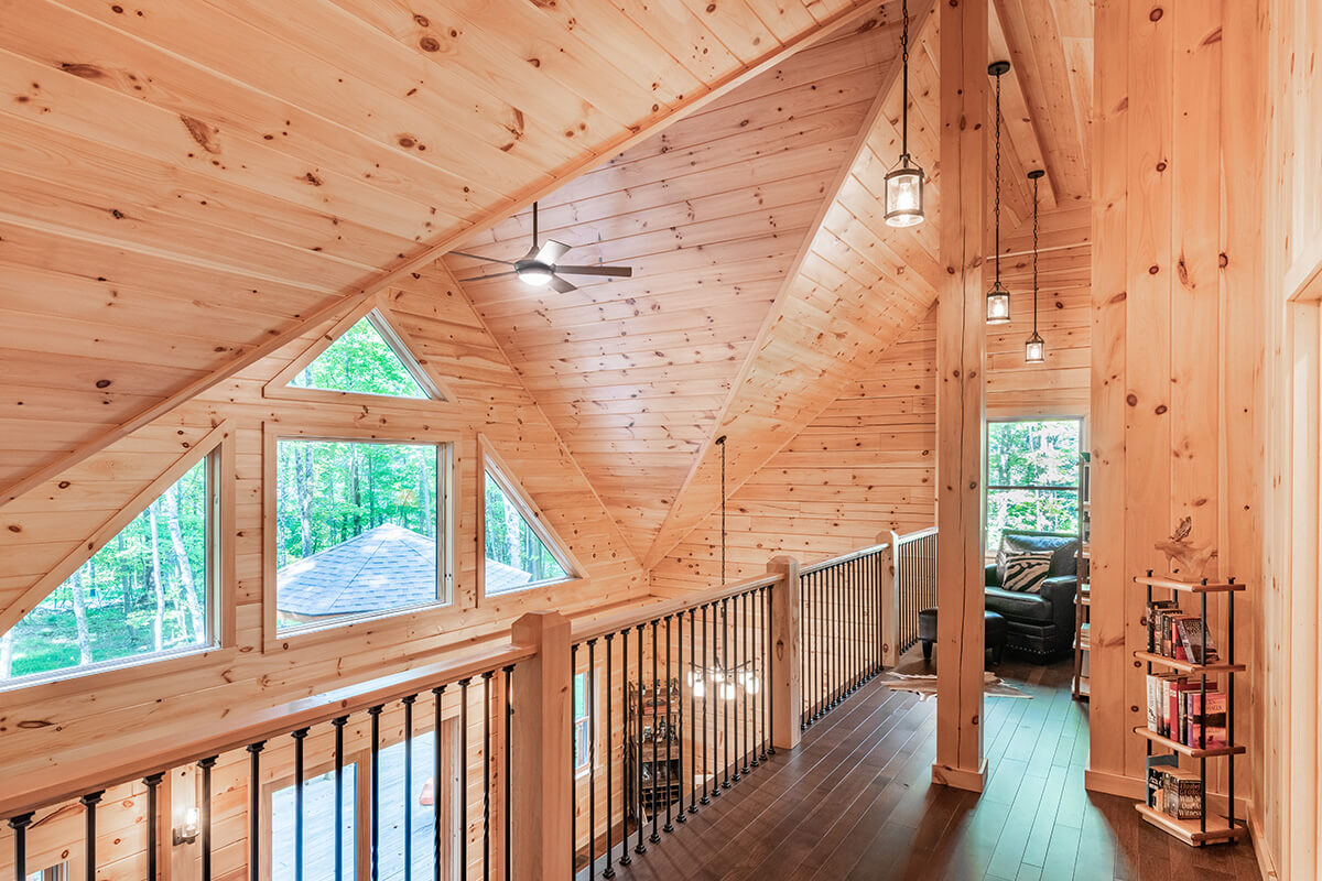 The Cascade model has an efficient and dramatic entrance with a scissor-switch staircase to the left and a coat closet to the right. The bathroom is conveniently located near the entry as well and the view to the open concept space shows the wall of windows that looks dramatic day or night. The open loft area acts as a hallway to three upstairs bedrooms and a bath. Outdoor spaces include a covered porch and an open deck.