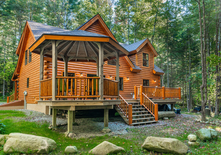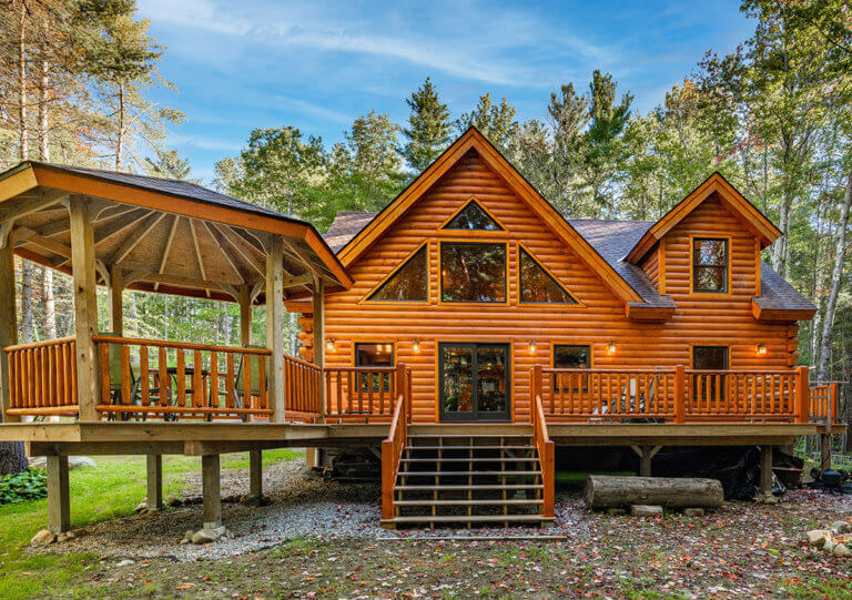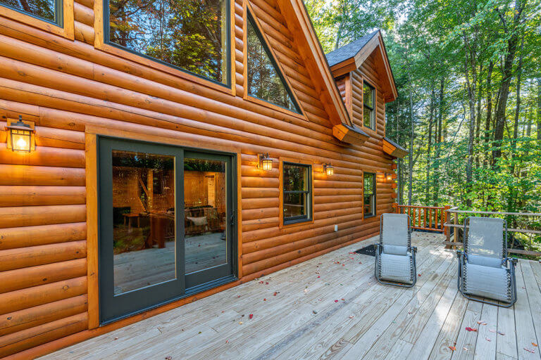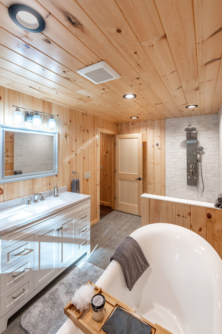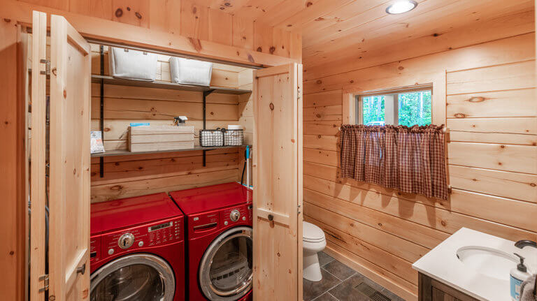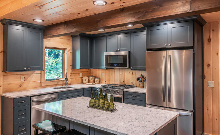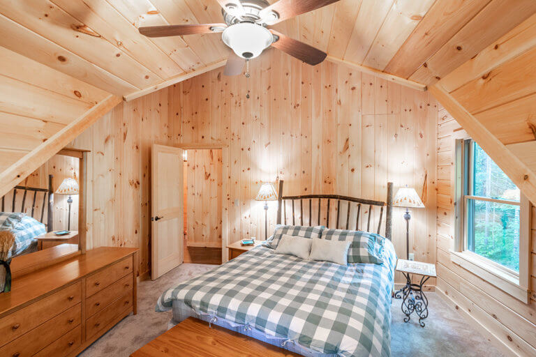 The Cascade model has an efficient and dramatic entrance with a scissor-switch staircase to the left and a coat closet to the right. The bathroom is conveniently located near the entry as well and the view to the open concept space shows the wall of windows that looks dramatic day or night. The open loft area acts as a hallway to three upstairs bedrooms and a bath. Outdoor spaces include a covered porch and an open deck.