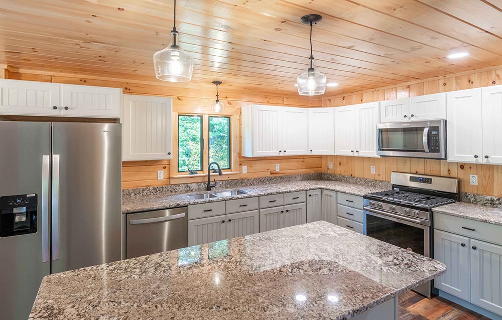 A practical take on one of our most popular log home designs, this model offers a covered front porch and open deck for outdoor living opportunities. The entrance opens to a cathedral ceiling over the living area. A shed dormer on one side and a wide gable dormer on the other, boosts its functionality and aesthetic value to the upstairs bedrooms. The master suite is on the first floor and conveniently has an adjoining walk-in closet as you enter the master bath.