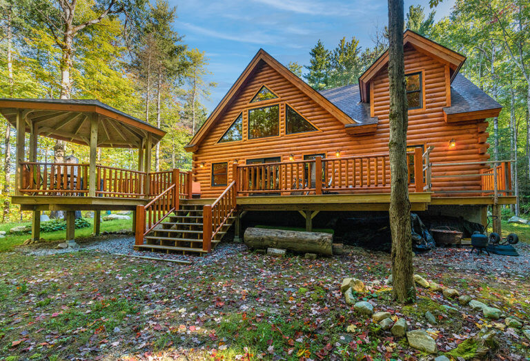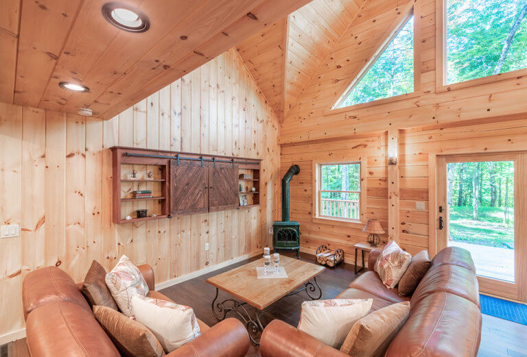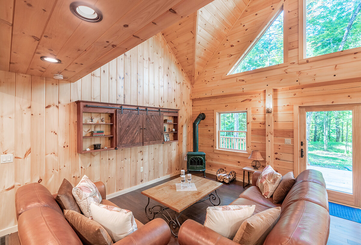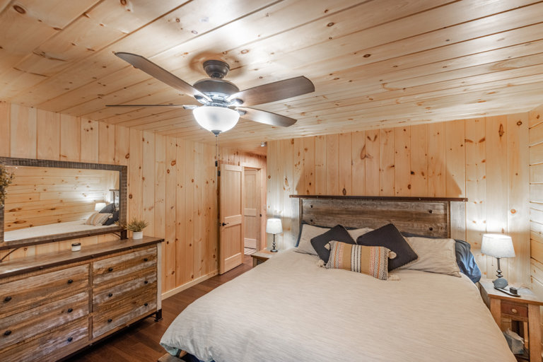 The Cascade model has an efficient and dramatic entrance with a scissor-switch staircase to the left and a coat closet to the right. The bathroom is conveniently located near the entry as well and the view to the open concept space shows the wall of windows that looks dramatic day or night. The open loft area acts as a hallway to three upstairs bedrooms and a bath. Outdoor spaces include a covered porch and an open deck.
